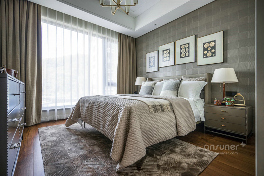 设计师利用对色彩的敏锐视角,以做旧的古罗马灰为主色调表达了主卧空间的优雅和感性,独具风情的格纹地毯,工艺精细的斗柜,艺术装饰画和精心布置的装饰品,让空间有着不同韵律的过渡。