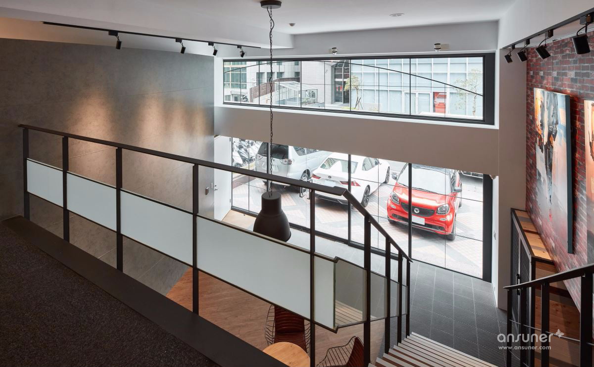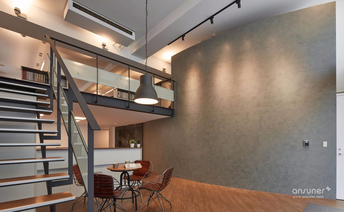 善用挑高空间打造大面积落地窗,并以大量镂空铁件彰显利落气息,设计师更巧妙使用仿红砖壁纸、仿清水模漆以及木纹塑胶地砖,大幅降低装修预算,完成工业风格营造。以一道吧台巧妙分隔接待区与后方会议空间,兼具隐私与置物功用,更利用结构墙下方畸零空间规划柜体,拓增收纳机能。二楼以办公空间为主,以开放设计与纯白色调一扫传统 OA 办公的制式呆版,将有着通风孔设计的无印风置物柜贴齐壁面,让行进动线更加流畅,小型会议室的玻璃隔间更抹除狭小阴暗的可能性。
